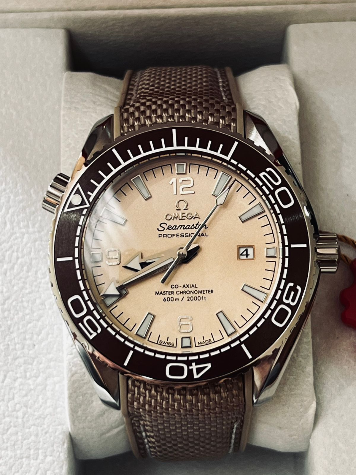 The Omega Seamaster Planet Ocean with its distinctive brown ceramic bezel, matching strap, and elegant cream-colored dial offers a refined take on a professional dive watch. While engineered for performance with 600m water resistance, a helium escape valve, and Omega’s renowned Co-Axial Master Chronometer movement, this model also stands out as a sophisticated style piece