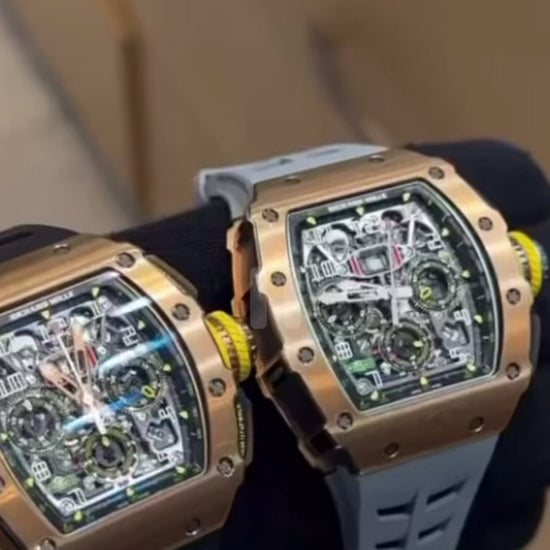 The Richard Mille Rose Gold is a luxurious expression of the brand’s avant-garde watchmaking, combining its bold, futuristic designs with the timeless elegance of precious metal. Crafted from solid 18k rose gold, the case highlights Richard Mille’s signature tonneau shape, showcasing both technical mastery and aesthetic refinement. Inside, the watch often features advanced complications such as tourbillons, skeletonized movements, or flyback chronographs, all visible through sapphire crystal to reveal the intricate engineering. The warm tones of rose gold contrast beautifully with modern materials like titanium or carbon, creating a perfect balance of tradition and innovation. Exclusively produced and instantly recognizable, the Richard Mille Rose Gold stands as a statement of prestige, performance, and cutting-edge luxury.