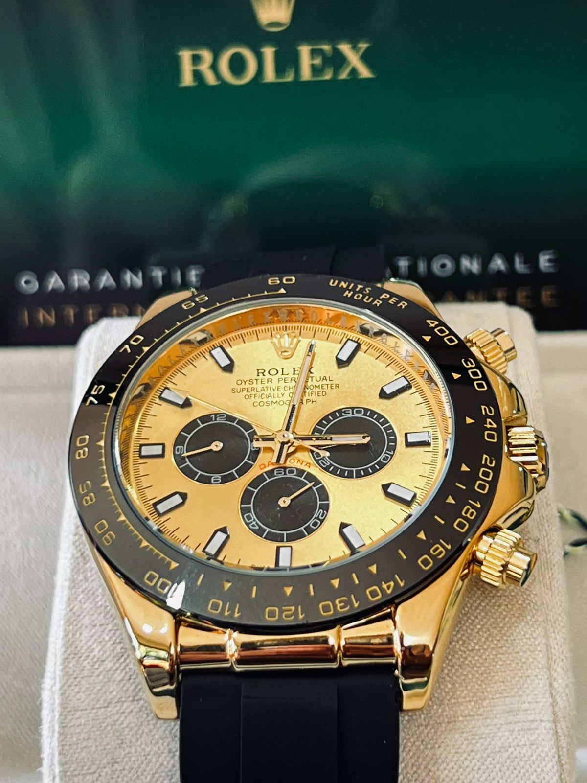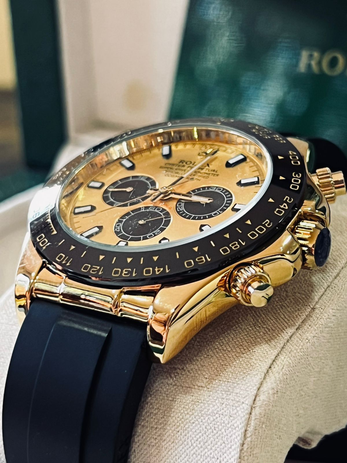 The Rolex Cosmograph Daytona in yellow gold with a black Oysterflex bracelet is the perfect balance of elegance and performance. Designed for speed and endurance, the Daytona is powered by Rolex’s Calibre 4130 chronograph movement, renowned for its precision and reliability. Its luxurious gold case is complemented by a sleek black dial, creating a bold contrast that enhances legibility and style. The innovative Oysterflex bracelet combines the durability of a metal blade with the comfort of high-performance elastomer, offering a sporty yet refined look. This Daytona embodies the spirit of motorsport while standing as an unmistakable symbol of prestige and timeless design.